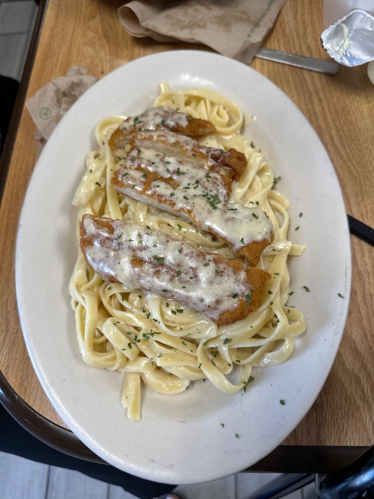 Imported Italian fettuccine tossed with our home made creamy Alfredo. Topped with breaded or grilled chicken Served with garlic bread and your choice of house or caesar salad.