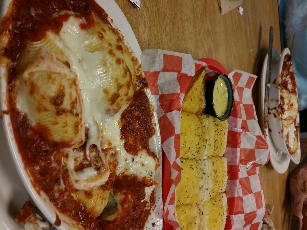 Jumbo ricotta and cheese filled pasta shells cooked in marinara topped with melted mozzarella cheese. Comes with garlic bread and house or caesar salad